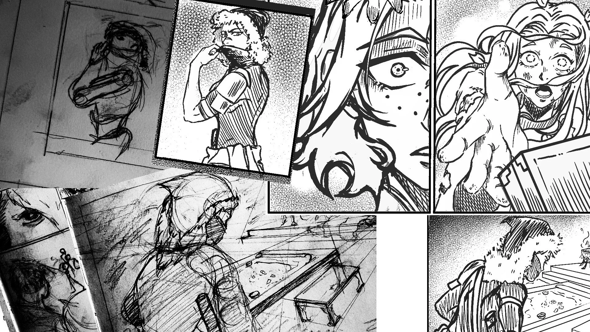 I then create a “blueprint” of the page, showing where each panel goes, the composition, placement of speech bubbles, character expressions, and any other important details.