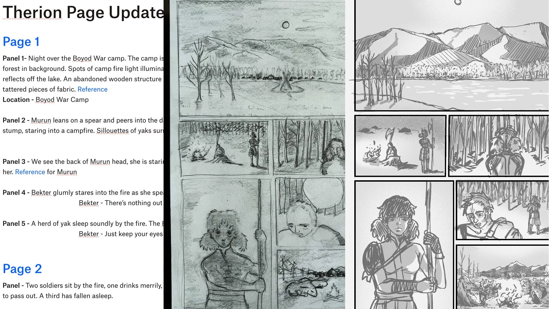 I start by writing a script for each page. Each page is broken into “panels” — the frames that make up a comic page, each with its own drawing.